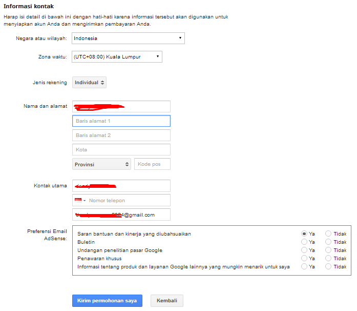 Setelah itu klik "Simpan dan Lanjutkan" Lalu akan muncul tampilan seperti di bawah ini. Silahkan isikan Negara,Zona Waktu,Jenis Rekening,Nama Dan Alamat,Alamat,Provinsi,Kode Pos,Preferensi Email Adsense Dan Nomor Telepon. jika anda mau lanjut ke tahap berikutnya semua yang saya sebutkan wajib di isi!
